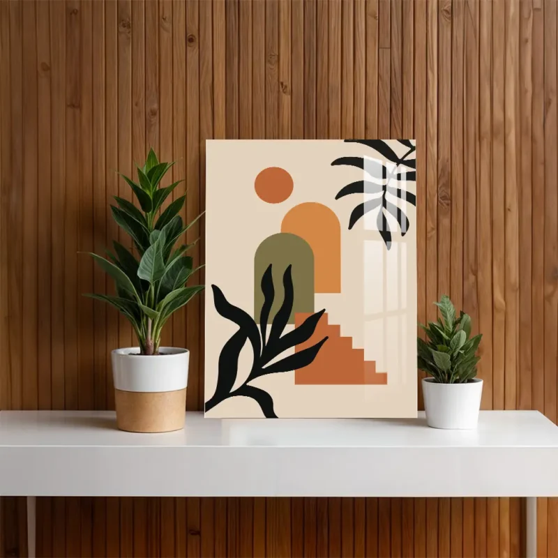 Terracotta Sun and Leaf Silhouettes – Boho Abstract Metal Poster